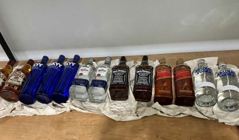 According to police, 14 bottles of alcohol were recovered from the vehicle. A subsequent search of his clothing revealed rubber packets containing drugs.