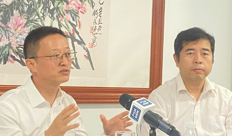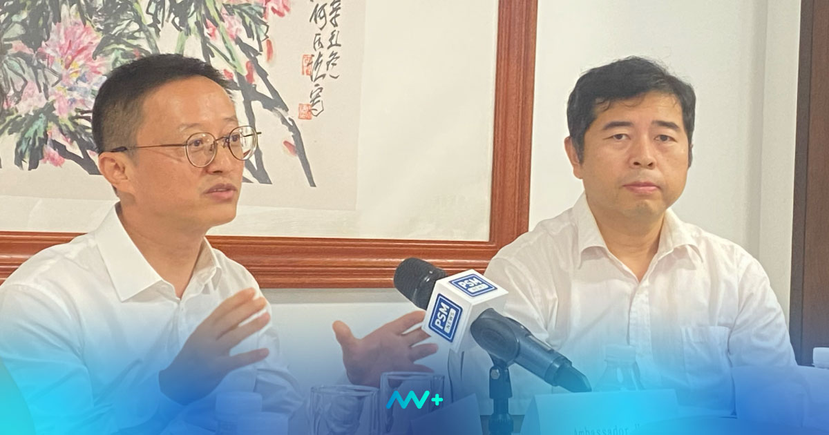 The Chinese Ambassador to the Maldives, Kong Xianhua (L), speaking to the press in Tho Residence, Hulhumale, on September 11, 2025 | Photo: MV+