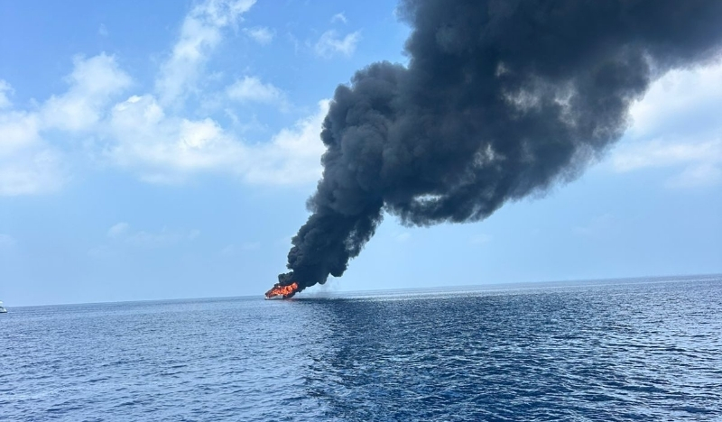 A photograph shared by the MNDF showed a boat at a distance from the vessel from which the image was taken, with a thick plume of smoke rising into the air.