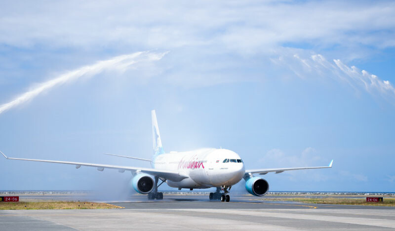 The Maldives on Tuesday officially celebrated the completion of the Maafaru International Airport upgrade project with the arrival of a wide-body aircraft operated by national airline Maldivian. The aircraft, an A330, was welcomed with a ceremonial water salute, marking the operational readiness of the expanded runway and upgraded facilities.