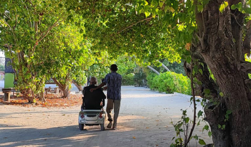 A man assists an elderly person in a wheelchair along a shaded, tree-lined path. | Photo credit: MV+