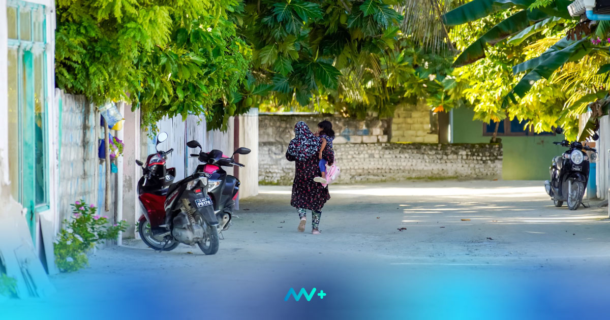 A woman walks down a street on a Maldivian island, carrying a child. | Photo credit: MV+