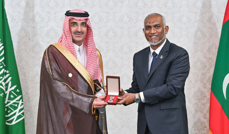 President Dr Mohamed Muizzu presented the Order of the Dignified Rule of the Muleege Dynasty to Sultan bin Abdulrahman Al-Murshid during an official ceremony held at the President’s Office yesterday morning.