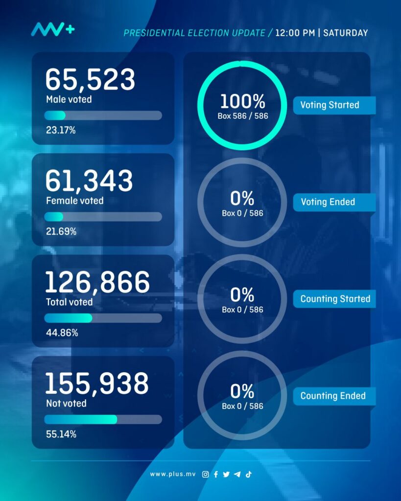 As of 12PM today, Election Commission of Maldives (ECM) reported that 126,866 people have already voted, which amounts to 44.86% of eligible voters.