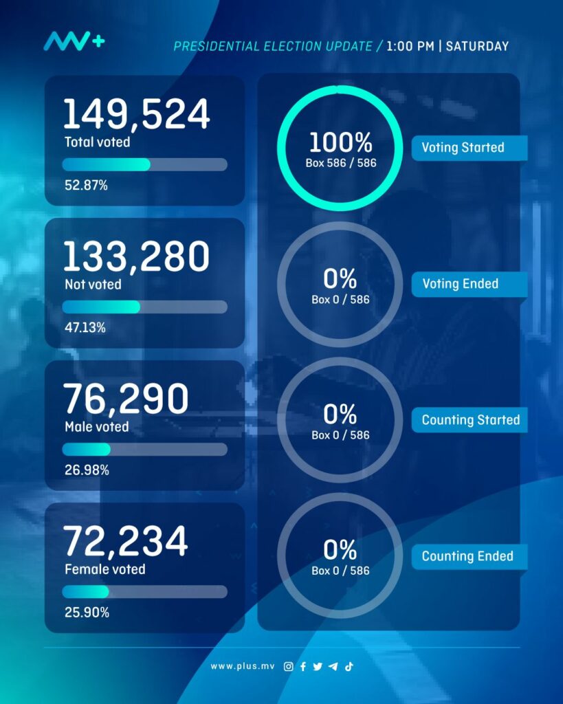 As of 1 PM today, Election Commission of Maldives (ECM) reported that 149,524 people have already voted, which amounts to 52.87% of eligible voters.