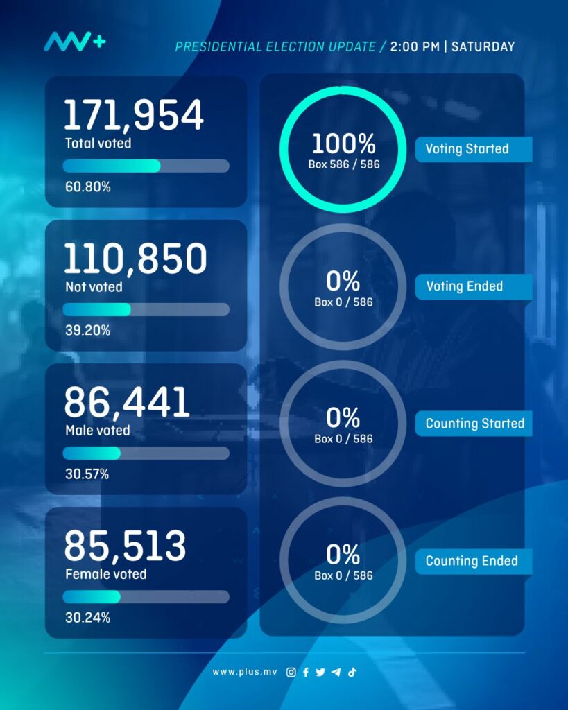 As of 2 PM today, Election Commission of Maldives (ECM) reported that 171,954 people have already voted, which amounts to 60.80% of eligible voters.