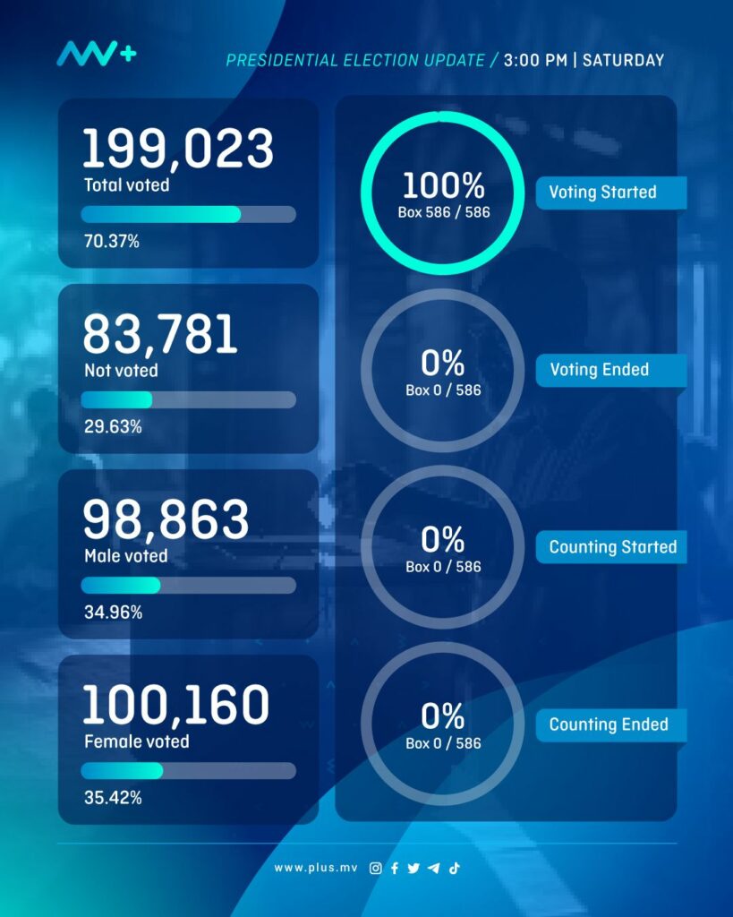 As of 3 PM today, Election Commission of Maldives (ECM) reported that 199,023 people have already voted, which amounts to 70.37% of eligible voters.