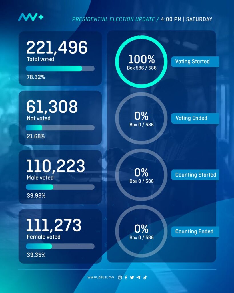 As of 4 PM today, Election Commission of Maldives (ECM) reported that 221,496 people have already voted, which amounts to 78.32% of eligible voters.