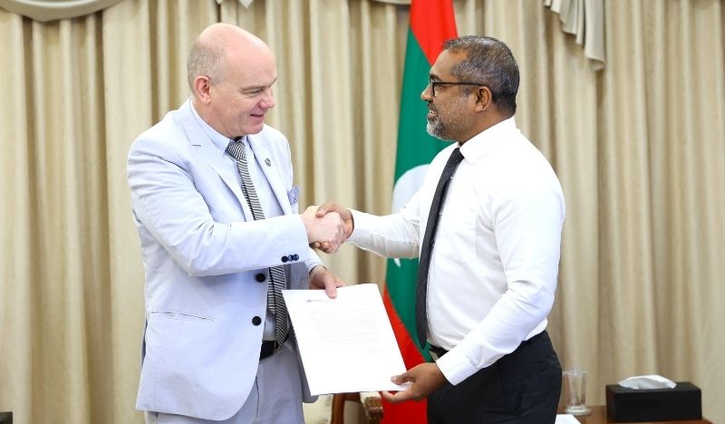 The new United Nations Office on Drugs and Crime (UNODC) Regional Representative for South Asia, Kristian Hӧlge, presented his Letter of Appointment to the Minister of Foreign Affairs, Dr Abdulla Khaleel, today.