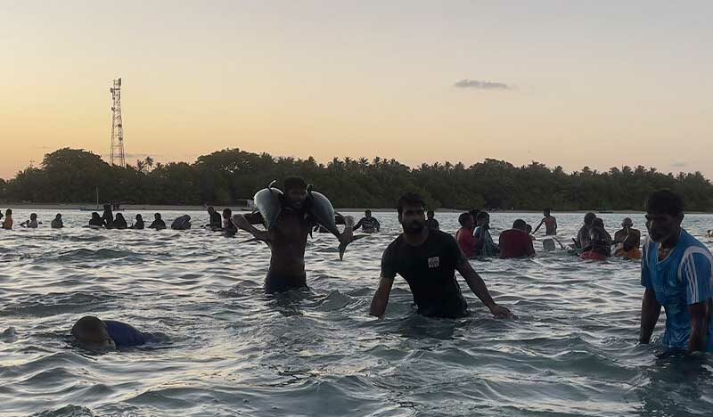 A council member representing Maafaru reported that the fish were brought ashore at 7:30 pm. Notably, the event witnessed the enthusiastic participation of men, women, children, and visitors of the island.