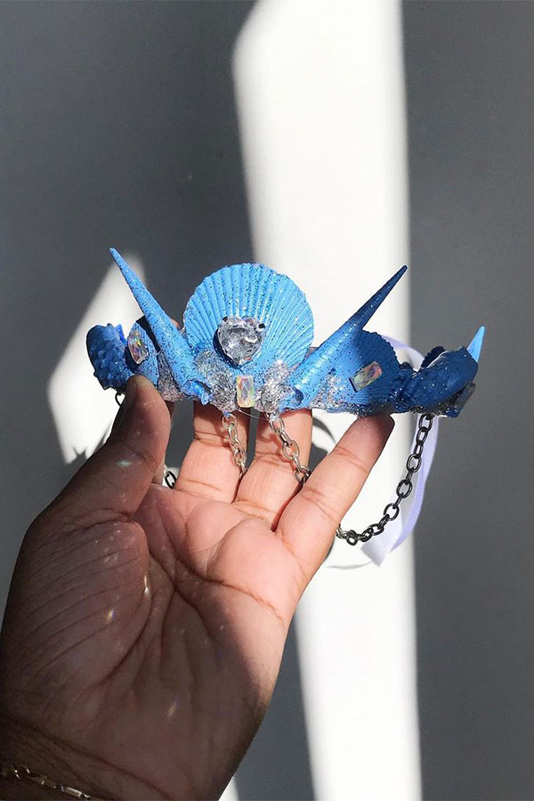Her shell crowns, studded with sea shells, are particularly popular, and go well with costumes. They are are also perfect for special occasions.