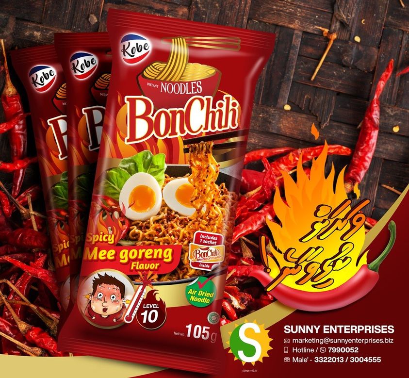 Sunny Enterprises has also introduced Kobe Bonchili Noodles to the Maldives. To prepare the instant noodles, simply boil Bonchili noodles for 3-4 Minutes, drain Bonchili noodles, mix with seasoning which is included in the package and add Bonchili Spicy Sprinkle to taste.