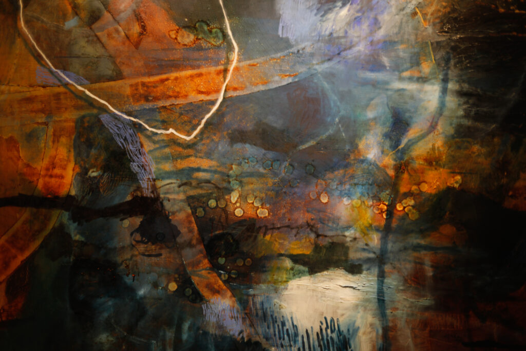 Works such as Sea Dance (2019) and Sound of Blackbirds through Thunderstorms (2019) suggest rhythm and resonance, where marks and gestures echo natural phenomena without literal depiction. In Consciously Floating (2019), scale becomes immersive, drawing the viewer into a field of colour and motion that feels both expansive and intimate. Elsewhere, pieces like Obscured Conversations (2019) introduce thread into the composition, subtly binding and interrupting the painted surface, hinting at communication that remains partial or unresolved.