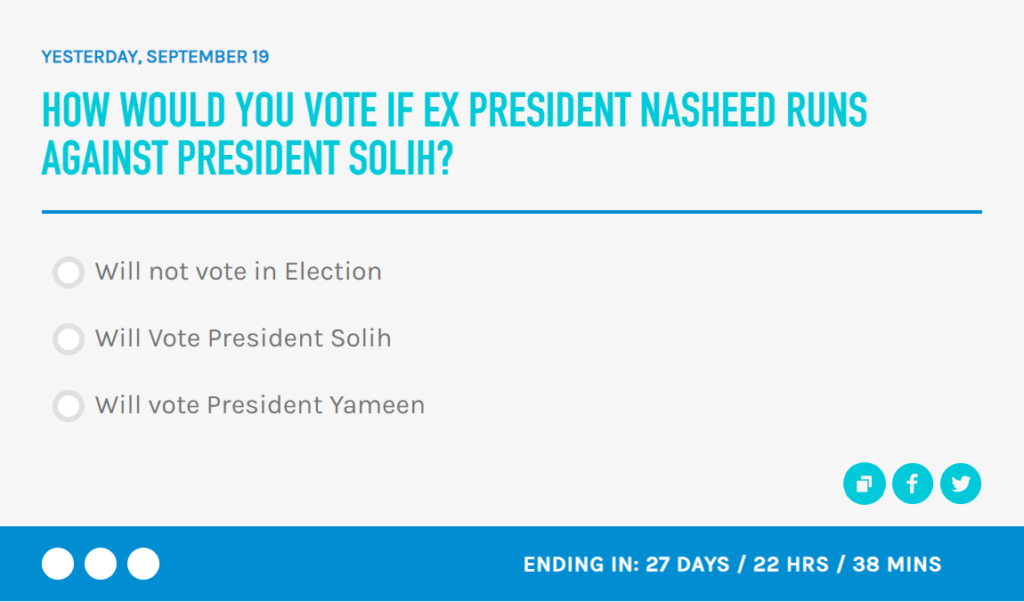 އެމް.ވީ.ޕްލަސް ޕަބްލިކް އޮޕީނިއަންގެ ޒަރިއްޔާއިން މިއަންނަ ރިޔާސީ އިންތިހާބާއި ގުޅުވައިގެން ދެ ޕޯލްއެއް ނަގަން ފަށައިފި އެވެ. މީގެ ތެރެއިން އެއް ޕޯލްގައި މިހާރުގެ ރައީސް އިބްރާހިމް މުހައްމަދު ސާލިހްއާއި ކުރީގެ ރައީސް އަބްދުﷲ ޔާމީންއަށް އަޅާ ކިޔާ މަގުބޫލުކަން ނެގޭނެ އެވެ.