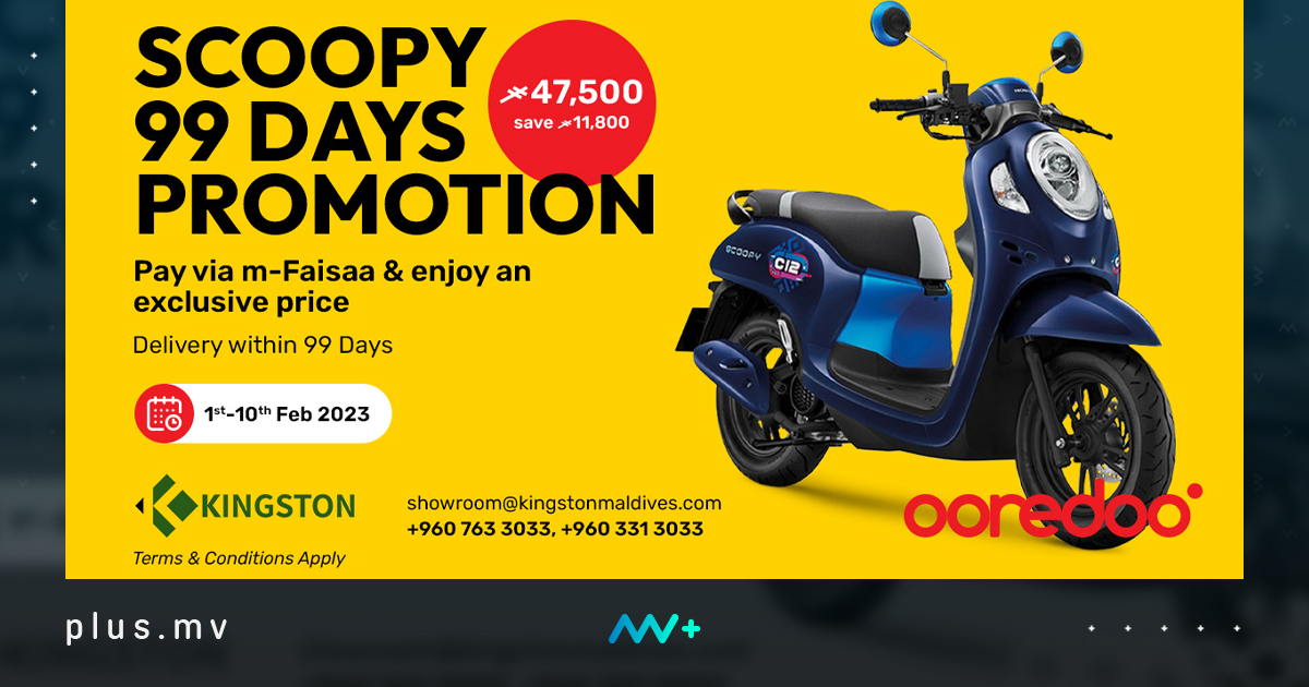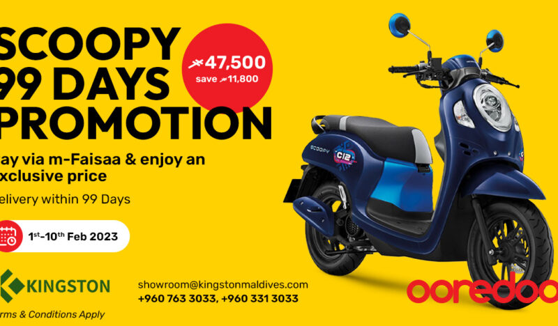 އުރީދޫ މޯލްޑިވްސް އާއި ކިންގްސްޓަން މޯލްޑިވްސް ގުޅިގެން އެމް-ފައިސާ މެދުވެރިކޮށް ފައިސާ ދައްކާ ކަސްޓަމަރުންނަށް ސްކޫޕީ ސައިކަލުން ހާއްސަ ޑިސްކައުންޓް އޮފާއެއް ލޯންޗްކޮށްފިއެވެ. މި ޕްރޮމޯޝަންގެ މުއްދަތުގައި ކިންގްސްޓަން ޝޯރޫމުން ސްކޫޕީ 2023 މޮޑެލް ސައިކަލަކަށް އެމް-ފައިސާ މެދުވެރިކޮށް ފައިސާ ދައްކާ ކަސްޓަމަރުންނަށް 11،899 ރުފިޔާ ގެ ޑިސްކައުންޓެއް ލިބިވަޑައިގަންނަވައެވެ. މި އޮފަރ ކުރިއަށް ދާނީ 10 ފެބްރުއަރީ 2023 ގެ ނިޔަލަށެވެ. މި އޮފަރ ގެ ދަށުން ބައްލަވައިގަންނަ ސައިކަލް ކަސްޓަމަރުނަނަށް 99 ދުވަސް ތެރޭ ކިންގްސްޓަން އިން ޑެލިވަރ ކޮށްލަދޭނެއެވެ.
