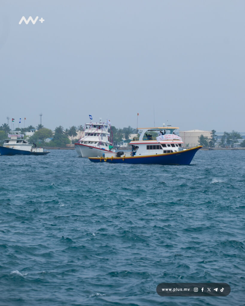 The BKMU protest began on 10 December, on the occasion of Fishermen’s Day, from Hulhumale Kanneli jetty. A flotilla of over 50 vessels then sailed to the outskirts of Male’, stretching from the Presidential Jetty to Masveringe Park. Photo: MV+