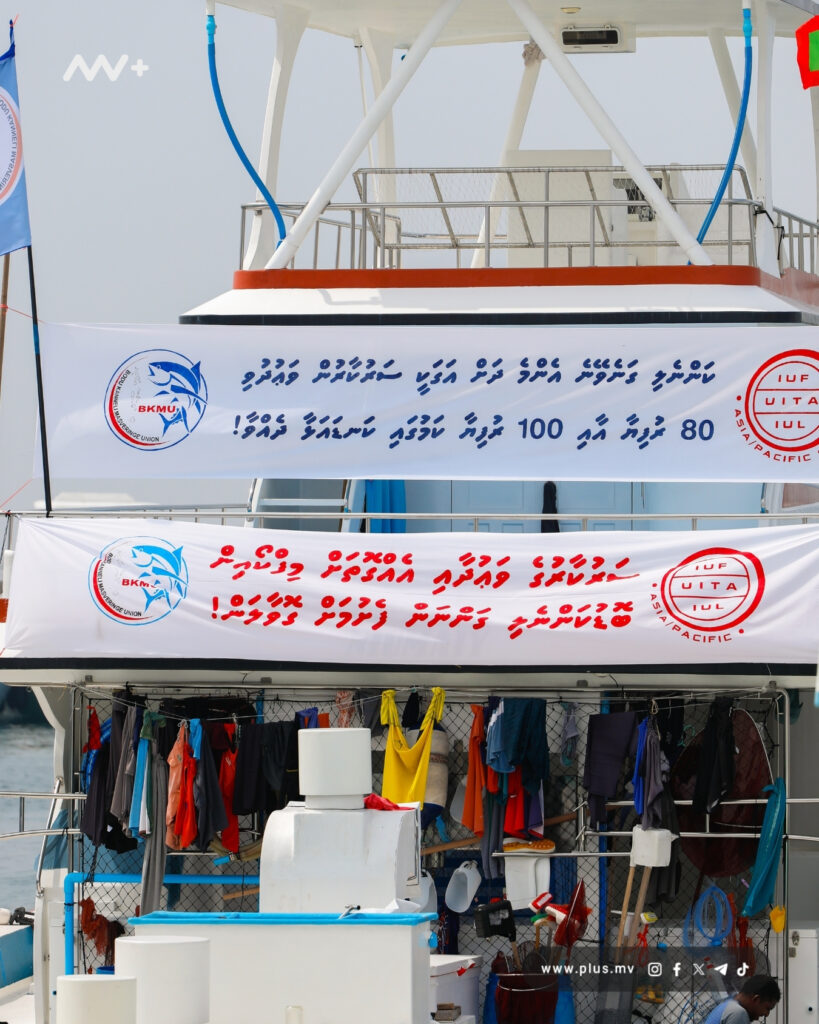 The BKMU protests continued for two days before the Maldives police service went onto vessels to arrest protestors. They arrested several expatriates and Kendhoo MP Mauroof Zakir, who holds the General Secretary position of the union. | Photo: MV+Photo: MV+Fishing vessels docked at the Hulhumale Kanneli Jetty still display the banners used in the protest. | Photo: MV+